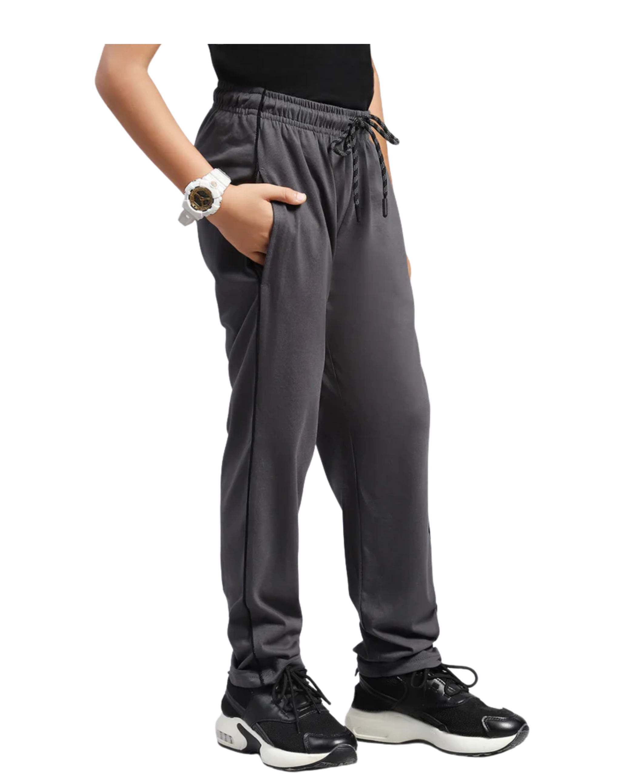 Designed for comfort and everyday style, these dark grey track pants are perfect for active days and relaxed wear. Made from soft, breathable fabric, they offer a comfortable fit with an elasticated waistband and adjustable drawstring for easy wear. The straight-leg design and side pockets add both style and functionality, making them ideal for sports, playtime, or casual outings