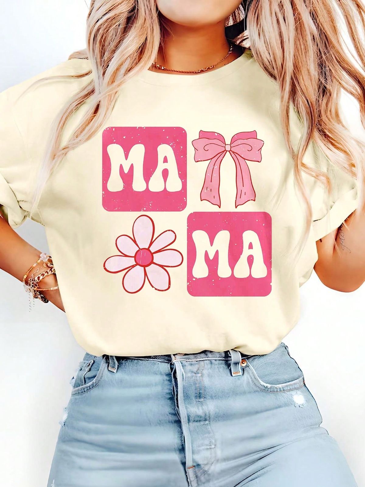 Adding to its unique charm are the playful illustrations—a delicate pink bow and a blooming daisy—that tap into the popular coquette aesthetic. Whether you’re running errands, heading to a playdate, or enjoying a rare moment of “me time,” this tee keeps you feeling comfortable and looking effortlessly cool. The durable print is designed to withstand the “chaos of mom life” while maintaining its vibrant color. Style it with your favorite light-wash denim and gold accessories for a complete, Pinterest-worthy outfit.